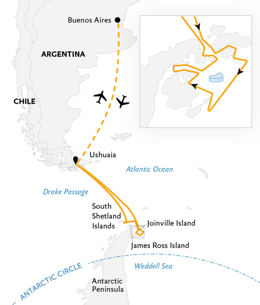 Spend more time in the remote, ice-laden Weddell Sea—home to massive Adélie penguin colonies and colossal tabular icebergs—than you ever imagined possible. While many Antarctic itineraries attempt to include the Weddell, they typically spend just a day here, two at most. Our 12-day Antarctic Peninsula: A Rare Exploration of the Weddell Sea devotes three to four days in the farthest reaches of the Weddell Sea and Antarctic Sound. In fact, our arrival in Antarctica coincides with the Winter Solstice, December 21, 2027. Guided by our seasoned Expedition Team, this route is designed with maximum flexibility to adapt to shifting conditions and reach rarely visited sites few travelers ever see.